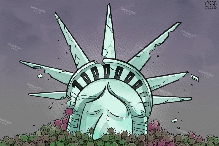 美国新冠死亡病例破百万,这是对其自诩的“人权卫士”名号的最大讽刺。(漫画作者:中国日报美术部 宋晨)