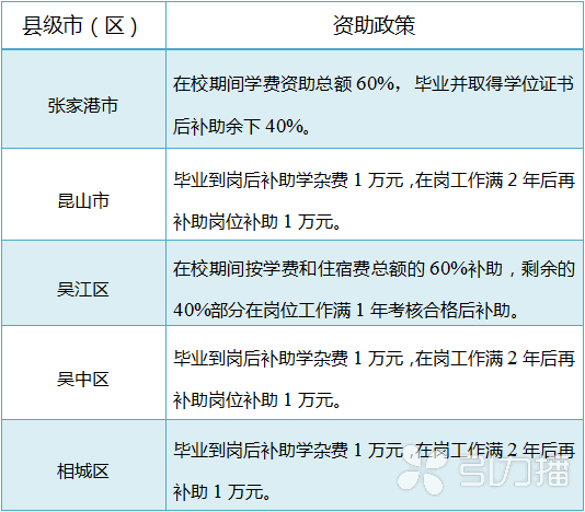 苏州各县市区对委托生培养制定了相关资助政策,比如,张家港市的政策为:在校期间学费资助总额60%,毕业并取得学位证书后补助余下40%;昆山市则为:毕业到岗后补助学杂费1万元,在岗工作满2年后再补助岗位补助1万元。部分地区还设立定向委培生专项奖学金等资助政策。