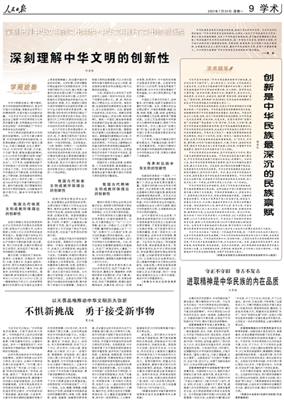 中华民族是具有非凡创造力的民族,创造了伟大的中华文明。习近平总书记深刻指出:“中华文明具有突出的创新性,从根本上决定了中华民族守正不守旧、尊古不复古的进取精神,决定了中华民族不惧新挑战、勇于接受新事物的无畏品格。”深刻把握中华文明突出的创新性,进一步坚定文化自信,坚持守正创新,对于我们在新征程上推进理论创新、实践创新、制度创新、文化创新以及各方面创新,全面建设社会主义现代化国家,建设中华民族现代文明,具有十分重要的意义。今天的学术版围绕“中华文明具有突出的创新性”进行阐述。