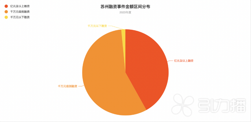 从融资金额上看,去年苏州已披露融资金额的260起融资事件中,有109起融资事件完成亿元及以上融资,占比41.92%,同比2022年减少17起。低于1000万元的融资事件则仅有4起,其余均为千万元级别的融资。