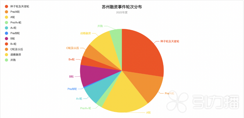 从融资轮次上看,去年苏州披露融资轮次的434起融资事件中,近7成处于早期融资,有291起,再次体现出苏州有着充足的优质初创项目储备。其中,种子轮及天使轮共117起,Pre/A轮51起,A轮80起,Pre/A+轮11起,A+轮32起。另外,战略融资和并购分别有39起和21起。