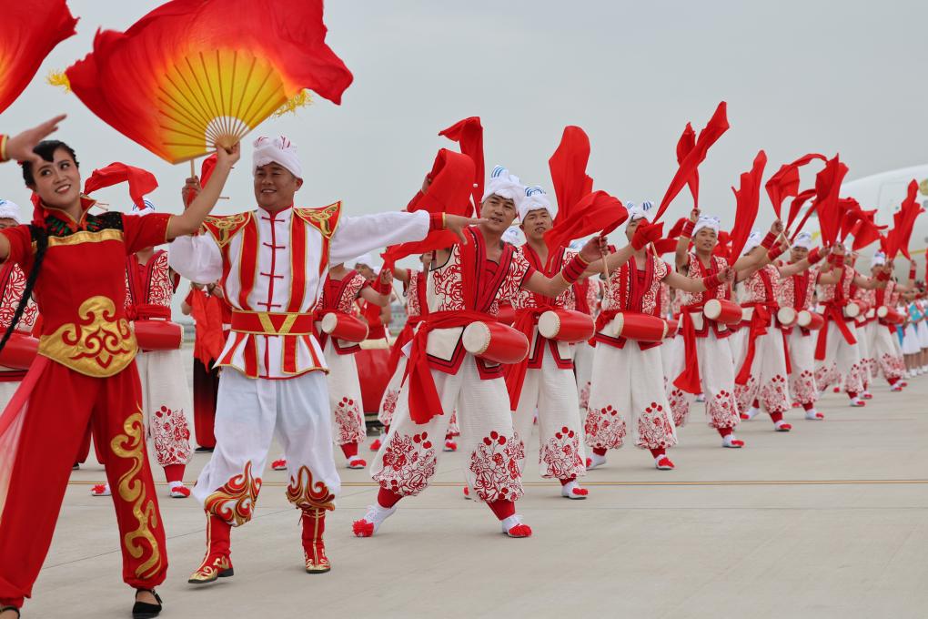 2023年5月17日下午,出席中国-中亚峰会的哈萨克斯坦总统托卡耶夫抵达陕西省西安市。当地民众以热情的腰鼓、欢快的秧歌等民间艺术表演欢迎贵宾到来。新华社记者 邢广利 摄