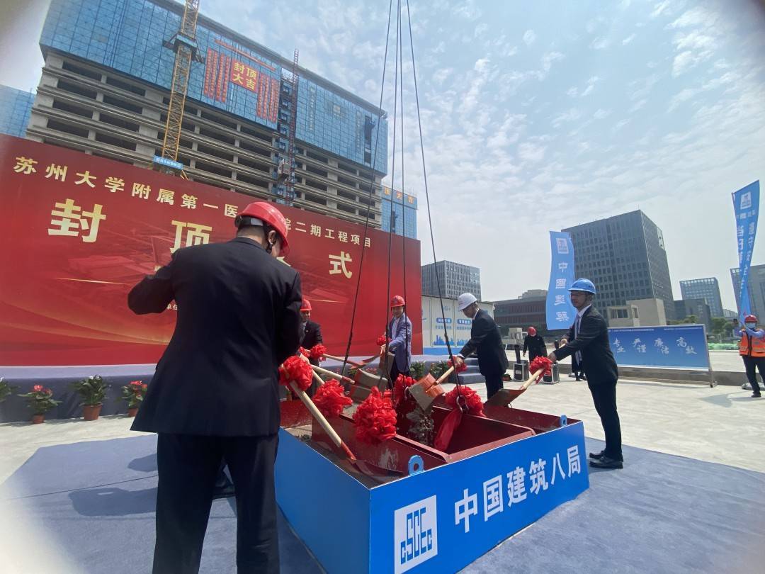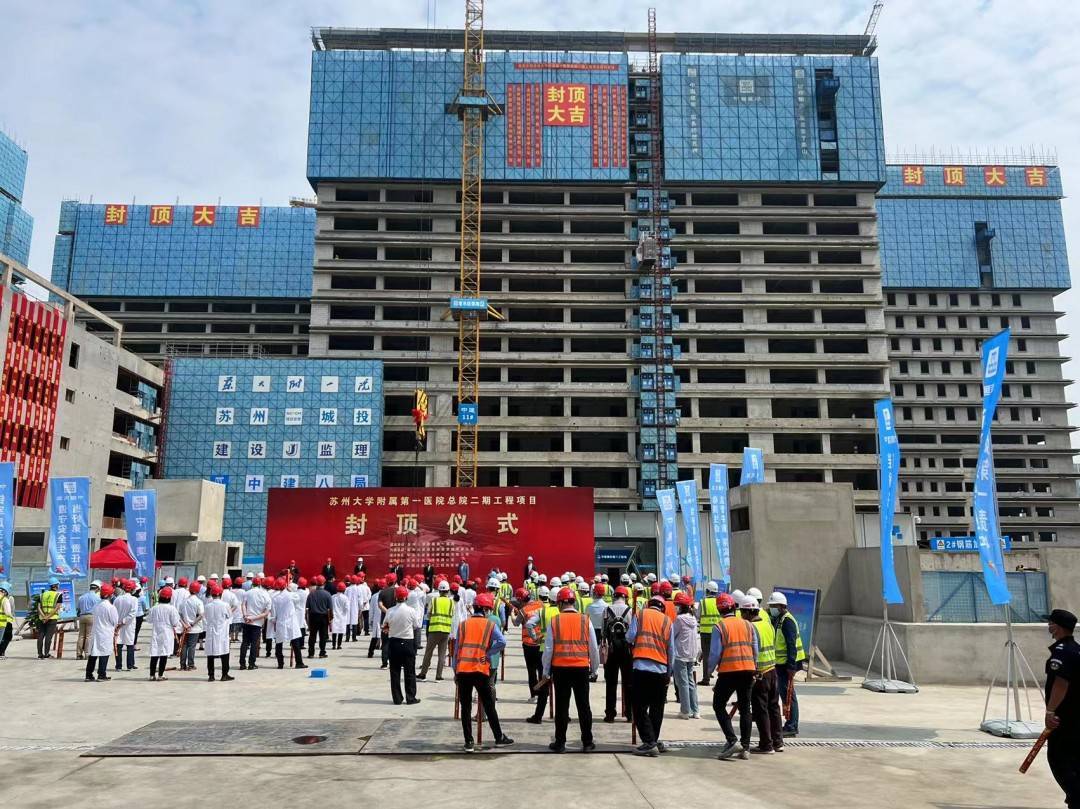 总院二期工程项目于2018年12月29日举行奠基仪式,经过各项筹备后,2020年4月2日正式开工。经过一年多的建设,二期西区主体结构于2021年8月28日率先封顶,东区主体结构也在今天顺利封顶。这也意味着苏大附一院二期项目已经基本按原进度计划全部完成主体结构建设,也为后续的内外部装饰和机电、医疗设施等专项施工提供了坚实的基础保障。