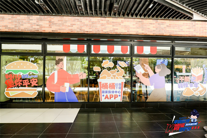 走进“平安主题餐厅”,肯德基当家产品Kcoffee、老北京鸡肉卷、全家桶等纷纷为反诈“代言”,“没有什么伎俩是一杯Kcoffee不能看穿的”、“学习要卷,TA给的链接不要点”、“桶桶给我下载反诈中心APP”,走心又上头的谐音梗,将反诈提示标语变得更生动有趣,让顾客在享用美食的同时也能潜移默化地提升防诈意识。