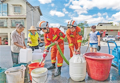 8月22日,消防救援队员在贵州省黔西市文峰街道兴黔社区为群众送水。
