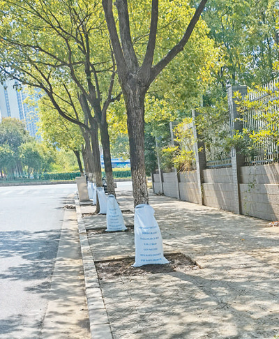 应对高温,江西省南昌市红谷滩区对辖区主次干道等重点路段10万多棵树木进行滴灌保湿。
