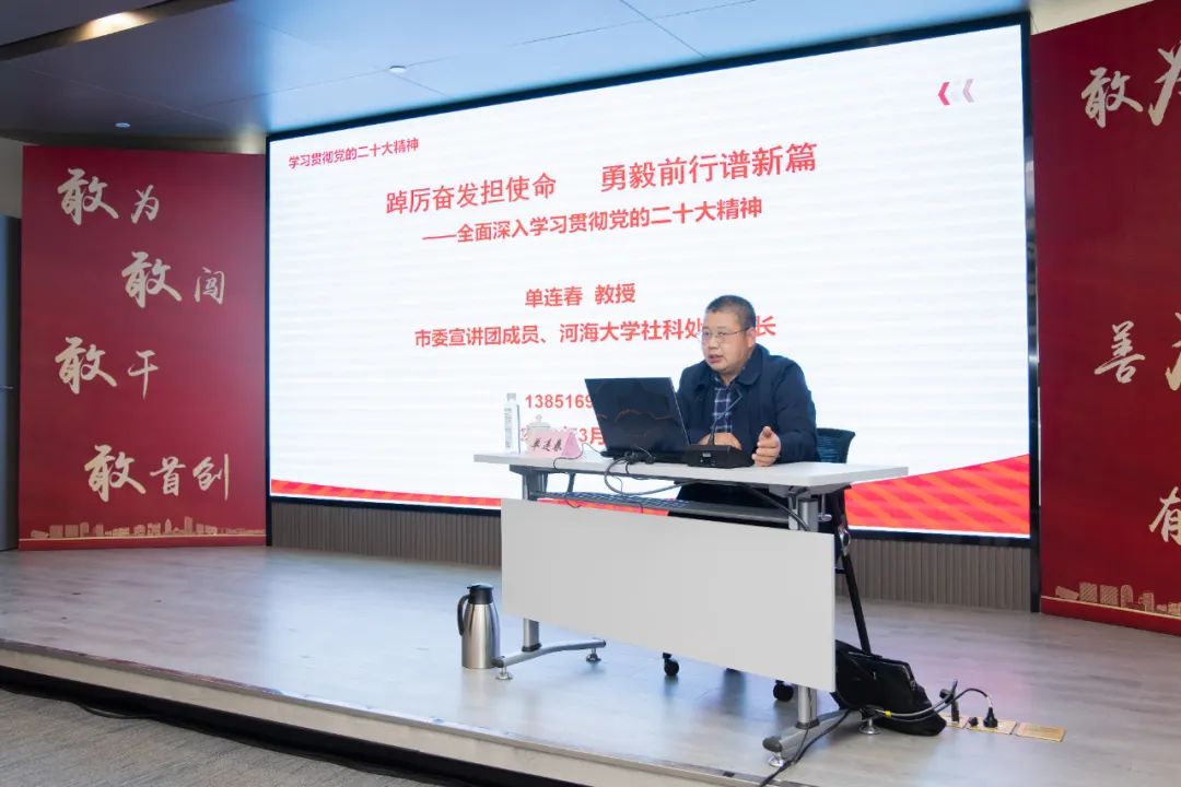 活动现场,2023年度“四为”干部培训班正式开班。开班第一课,由“元和棠”综合培育中心智库联盟成员单位河海大学苏州研究生院推荐的老师专题授课。市委宣讲团成员、河海大学社科处副处长单连春教授为与会人员带来了题为《踔厉奋发担使命 勇毅前行谱新篇》的政治理论课。单教授以“党的二十大报告理论内容和重要思想”为切入口为大家带来深入浅出的理论讲解,为元和干部进一步锚定政治方向、感悟初心使命、践行为民宗旨奠定理论基础。