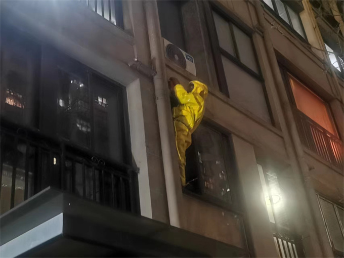 为防止马蜂蛰到居民,小胡第一时间拨打119请求帮助,联系物业工作人员设置临时警戒线,并在小区微信群里提醒居民注意绕行。同时,居民曹先生也在微信群里反馈自家浴霸排风口处也有马蜂筑巢垒窝。黄桥消防中队的消防员很快赶到,在小胡带领下来到现场,经验丰富的消防队员穿戴好防蜂服,利用铲子、蛇皮袋对马蜂窝进行清除。