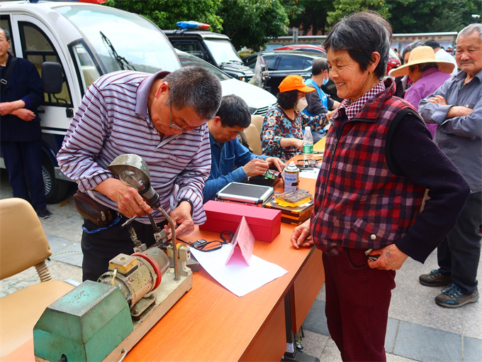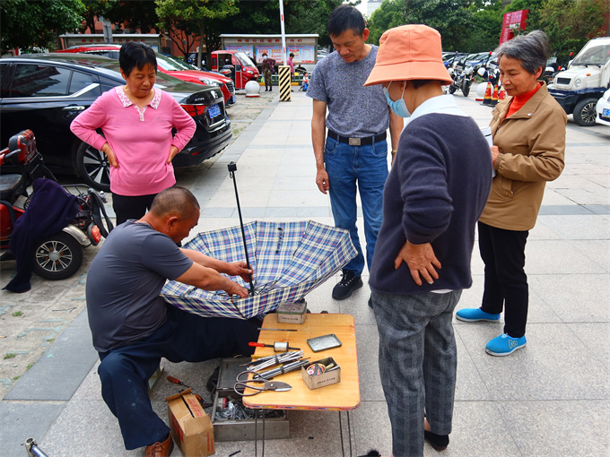 活动现场,还设置了多个便民摊位,邀请的师傅大多为残疾人,他们自强不息,自学手艺,现在正用自己的才能回报社会。他们还带来了特色手工文创作品,得到了大家的喜爱和赞赏。