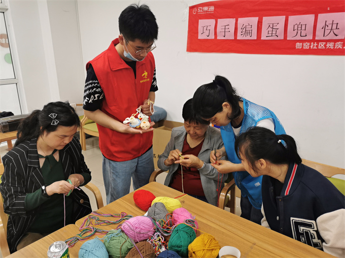 挂蛋是立夏节的一项传统习俗,为了弘扬中华民族传统文化,让残疾人感受传统文化气息,体验立夏节习俗,在立夏前夕,安康通工作人员和社区党员志愿者携手带领御窑残疾人之家的残疾人开展了“巧手编蛋兜,快乐迎立夏”主题活动。