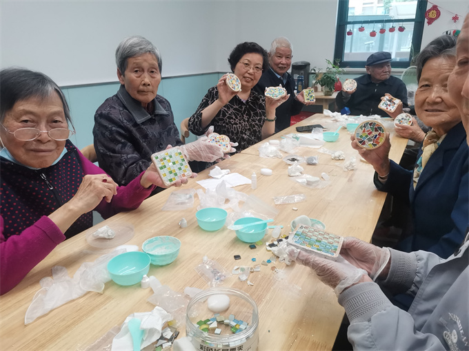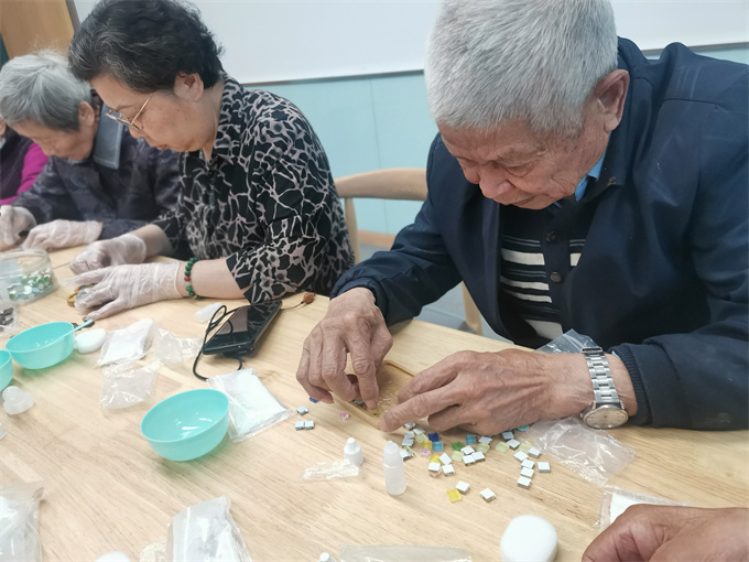 随后,团员志愿者为老人们发放了制作杯垫的材料包,在志愿者的帮助下,老人发挥自己想象力,细心地把一枚枚小小的马赛克贴在木质托盘上,同时补上填缝剂,一个个兼具实用性和艺术性的马赛克杯垫便完成了。