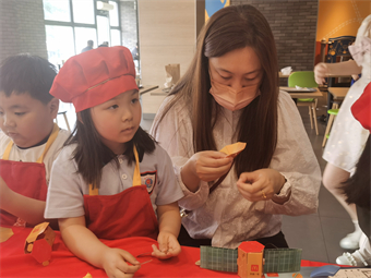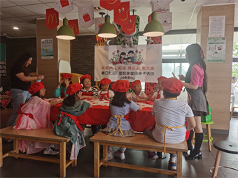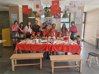 活动开始前,志愿者为每个家庭的小朋友发放了迷你版餐厅工作服,由家长们为孩子穿戴。为了活跃气氛,小朋友挨个介绍了自己的家庭,促进了彼此家庭的了解。随后活动主持人为大家介绍今天的亲子游戏环节:汉堡DIY、纸杯叠叠乐、航天卫星拼装竞速、参观餐厅厨房。