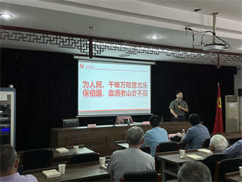 在活动现场,金瑞良老师作为老山作战的亲历者,从“南疆筑长城,血染风采”“战火中淬炼,艰难辉煌”“不朽的精神,老山之魂”这三个篇章,将党员们的思绪带回了那个风雨飘摇、动荡无比的的年代。金老师用一份份家书、一张张照片、一段段视频,描绘出三十多年前,在祖国的西南边陲,一群热血男儿,用自己的青春年华、鲜血生命为祖国筑起了一道坚不可摧的南疆长城的故事。
