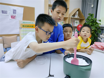活动开始前,相城高新区(元和街道)未成年人保护站社工首先通过图片,向小朋友们展示了元和未保站的工作内容和服务计划安排。接下来则是小朋友们期待已久的手工棒棒糖DIY。小朋友们把麦芽糖倒入锅中,边搅拌边煮热,直到全部融化,然后小朋友们拿着装满糖浆的量杯,小心翼翼地倒入卡通模具中。在等待凝固的过程中,社工带着小朋友们依次玩起了“一发即中”投壶游戏和“六一圈圈乐”套圈游戏,现场小朋友们聚精会神地瞄准壶口,争取一发即中!“六一圈圈乐”游戏,更是激起了活动的小高潮,看着一地精美的小礼品,小朋友们都使出浑身解数,努力瞄准目标,拼运气比眼力,个个都收获了不少心仪的小礼品。随着游戏的结束,桌子上的棒棒糖也都冷却定型了,散发着阵阵甜蜜的香味,小朋友们迫不及待地拿起自己的成果品尝了起来。小朋友们还纷纷表示,要把亲手做的糖果带给家人和小伙伴品尝,共同分享甜蜜。