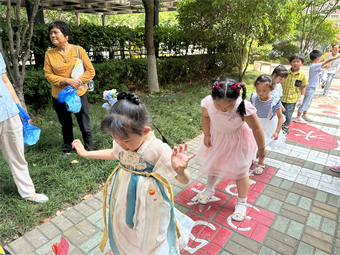 活动开始,党员志愿者组织大家观看中共中央总书记、国家主席、中央军委主席习近平5月31日在北京育英学校考察时的报道,一起聆听习爷爷的温情寄语。观看结束后,志愿者组织家长在空白书签上为小朋友写一句祝福或期望的话,然后送给小朋友。家长们有的抄录总书记的温情寄语,有的自己组织语言,还有的用绘画的形式表示祝福。小朋友们都大声读出爸爸妈妈写寄语,还不忘和边上的小朋友分享自己的书签。第三个环节,志愿者们挑选了5个勇敢的少年到前面领读《少年中国说》——梁启超,让优秀的华夏精神在我们的血脉中流淌,让灿烂的民族文化支撑我们的脊梁。参加本次活动的小朋友中,汪伊祎、高沐熙、余周奕3位小朋友每日坚持阅读打卡,获得“书香少年”的称号,现场工作人员为他们颁了奖,并呼吁现场的小朋友们一起养成良好的阅读习惯,一起加入“水韵花都社区韵爱护苗群”。室内活动结束后,大家在志愿者的带领下来到水韵花都二期中组团进行户外活动——跳房子。小朋友们的脸上都洋溢着快乐的笑容。