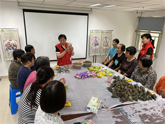 端午节的习俗有很多,比如挂香袋、吃粽子、插艾枝。社工老师向居民介绍了端午节的由来及习俗。糯米、红枣、粽叶等整齐地摆放在桌子上,片片芦苇片片情,粒粒红枣寄情意,各位阿姨迫不及待地大显身手,捋粽叶、放糯米、放肉、压实、捆扎,食材在阿姨们的巧手中随心翻动,一个翠绿的粽子就展现在大家眼前。阿姨们感受到节日的快乐,也感受到社区幸福大家庭的和谐温暖。活动尾声,大家围坐一起制作香囊,承民俗、挂香囊、端午节素有佩戴艾草香囊的习俗,意喻避邪驱瘟,祈求平安健康,阿姨们从穿针线开始,小小香囊,弥漫着中草药的清香,格外沁人心脾。老人们还纷纷表示:“重温端午传统民俗记忆,大家聚在一起聊聊家常,做香囊、包粽子很开心。”