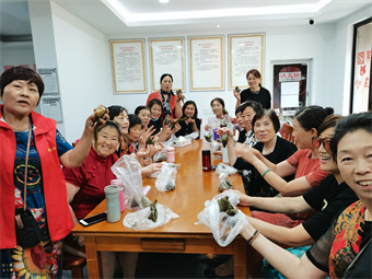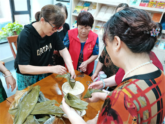 活动现场,海棠先锋志愿者和日照中心工作人员把提前泡好的糯米、粽叶等材料整齐地摆放在桌子上。大家围坐一圈,双手熟练地将粽叶卷成漏斗状,用糯米充实压紧,再将粽叶封口包好缠绕绑紧,巧手翻飞间,不一会儿,三角粽,枕头棕,小脚粽等各式各样的粽子就摆满了盘子。“我包的怎么和你包的不一样啊?”“糯米一定要压实,不然软软的,容易散掉。”在包粽子过程中,大家互相交流,互相学习,不会包的人拿着粽叶一步一步地跟着会包的学习,虽然有些包的不太好看,但是看着自己亲手包好的粽子很是欣喜。氤氲的热气在厨房里升腾而起,糯米被粽叶的香味浸染,浓浓的节日味道在活动室弥漫开来。大家一起品尝粽子,并将端午的“味道”带给了家人。端午节还有悬菖蒲挂艾草的习俗,在家门口悬挂菖蒲艾草可以驱除蚊虫,也承载着驱除邪气、杀菌防病的美好希冀。志愿者拎着菖蒲艾草,来到居民家中,帮她们把菖蒲挂门口并送上节日祝福,让居民们感受到祥和的节日气氛。