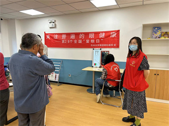 活动现场,苏州大学理想眼科医院的医务人员为居民普及眼睛保健和眼病预防知识,详细介绍了眼部构成和眼部疾病的成因、常见类型、对应表现以及相应的预防措施等。