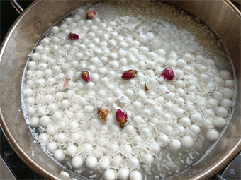 “酒酿圆子”是江南地区的特色美食。圆子是用糯米粉制作而成的,搭配着酒酿一起煮熟,吃起来甜滋滋的,还带着一些酒的香气。为了让老人们及时品尝到美味,工作人员提前采购了现成的酒酿,开火烧水,放入酒酿、冰糖,水开后将小圆子放进锅内,待小圆子一个个浮起再撒入些许玫瑰花,酒香中带着花香,佳肴天成。
