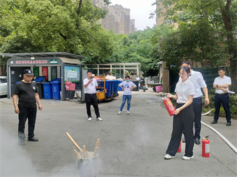 整场消防演习以“预防为主、防消结合、安全第一、全员参与”为原则,分成灭火组、警戒组、疏散组、设备组、救护组等若干小组,在工作人员拉响烟雾弹后,灭火组迅速出水灭火,居民们用湿毛巾掩住口鼻,弯腰前行,救护组迅速担架抬人,经由安排好的最近撤离通道来到广场,通过演练,大大提高了小区居民的自我保护意识和应急能力。随后,安保主管为居民详细讲解了灭火器的使用方法和火灾现场逃生知识,并让居民依次排队进行实操训练,现场学会如何使用灭火器,广泛宣传掌握火灾扑救的基本知识和要领。