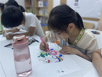 接着,团员志愿者让大家自由发挥,画出自己的小暑凉扇,并给每个孩子发放了草稿纸、水性笔、扇子和丙烯马克笔。孩子们迫不及待地发挥自己的想象力和创造力,认真投入创作。不一会儿,一把把单调空白的凉扇,被生动形象的画作填满,瞬间变成妙趣横生的扇画了。