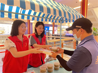 炎炎夏日,高温天气“炙烤”着坚守在户外一线的新业态劳动者们,他们是城市发展不可或缺的一支队伍,也是社会服务的重要力量。活动现场,党员志愿者们准备了冰绿豆汤、藿香正气水、风油精等防暑降温物资,热情了为在高温下辛勤工作的新业态劳动者们送去“清凉礼包”,并叮嘱他们要做好防暑降温措施,保护好身体健康。月星环球港作为辖区内的超大综合性商场,每天有大量外卖员、快递小哥、网约车司机等从这里经过,社区党组织结合实际需要,在这里设有爱心驿站,配有座椅、充电器、微波炉等便民设施,为奔波在路上的新业态群体提供一个可以“加油充电”的歇脚处。