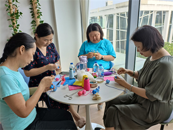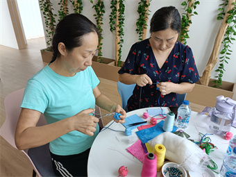 大家一边听老师讲解,一边积极动手实践,在老师的带领下,现场居民们细心投入,各色的线在钩针和手指间来回缠绕、编织,气氛十分融洽,每个人都期待着最终成品的诞生。