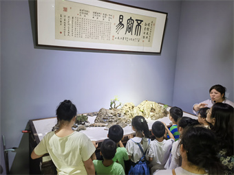 大石金生艺术馆坐落于小外滩街附近,倚靠千年元和塘,将非遗文化之美展现的淋漓尽致。当天下午,大家齐聚在展厅,按照艺术馆推荐的参观路线一一参观,倾听着李金生大师女儿的介绍,欣赏着一件件汇聚自然之美和工匠巧艺的展品,让大家目不暇接、叹为观止。参观过程中,讲解员也耐心地回答着大家的各种问题,并与大家热情互动,可以看出小朋友们对于赏石艺术品非常感兴趣。