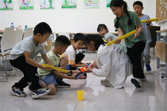 活动现场,青年团员志愿者先从自我介绍开始,让青少年之间相互认识和了解。随后,志愿者作为带领者,通过两个熟悉的小游戏,使成员之间的距离感缩小,沉浸在游戏中加深彼此的配合能力。在大家都互相熟悉以后,老师组织进行“珠行万里”游戏,消除彼此的陌生感,增强团队协作意识。随着小球的滚动,队员们手持接力棒不停地变换着位置和动作,确保小球顺利到达终点。完成接力任务后,队员们还聚在一起分享经验,玩得不亦乐乎。丁奕然同学作为已参与两年暑托班的老生表示:“社区的暑期活动课越来越丰富了,能够学到课堂以外的知识,真是太好玩了。”