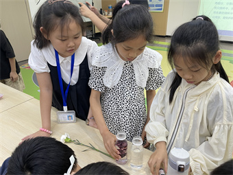 在进行理论讲解之后,老师为每一组同学发了两瓶矿泉水、一支康乃馨、两只不同颜色的染料,同学们自主动手将两瓶矿泉水染成不同的颜色,并将康乃馨分枝插入两瓶中放置前方,静置,观察康乃馨花瓣颜色的变化。