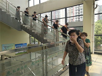 讲座结束后,在王老师的指导下,老年居民们开展了一次消防逃生演习。他们拿着手帕,捂着嘴,弯着腰,按照安全疏散指示,迅速而有序地撤离现场。