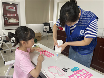 接着,老师拿出事先制作好的古风衍纸扇子成品,并向大家介绍制作衍纸扇子的基础方法。衍纸,也称卷纸,是纸艺的一种形式。以专用的工具将细长的七色彩纸一圈圈卷起来,通过卷、捏、拼贴成一个个小“零件”,然后自由组合成样式简单或复杂、形状不同的作品,是一种简单而实用的生活艺术,既有绘画的色彩表达能力,又有雕塑的空间视觉效果。讲完方法后,社区网格员将衍纸分发给大家,在老师和志愿者的带领下,小朋友们用衍纸笔将细长的纸条一圈圈卷起来,通过弯曲、折叠、捏塑、粘贴等多种手法,塑造出一个个水滴状的小“零件”。在小朋友的精心制作下,漂亮的扇子就完工啦。