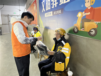 在文明驿站,青年志愿者为外卖小哥、快递员、环卫工人送上了热饮,发放保暖耳罩和保暖护膝,叮嘱他们在户外工作期间注意身体,做好防寒保暖工作。“平时为了多送点外卖一直没来得及去买耳罩和护膝,今天收到这两样东西,真的太及时、太温暖了,真的很感谢。”外卖小哥开心地道谢并穿戴起护膝。护膝不仅保暖,还印有“安全骑行,文明出行”的宣传标识,通过此举,引导新就业群体争做安全骑行的先行者、文明出行的示范者,同时充分发挥外卖小哥和快递员走街串巷、深入小区的优势,成为流动的文明行为倡导员,为文明城市建设工作注入新活力。