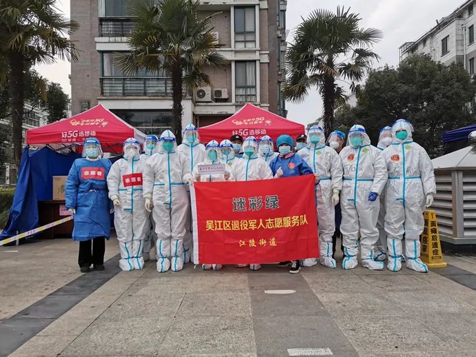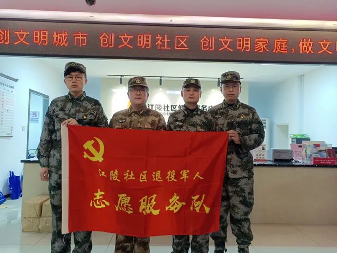 自本轮疫情发生以来,面对严峻形势,江陵街道退役军人志愿服务队第一时间开展防疫工作,迎晨送霭,步履匆匆,用实际行动践行了“退役不褪色、退伍不退志”的铮铮誓言。