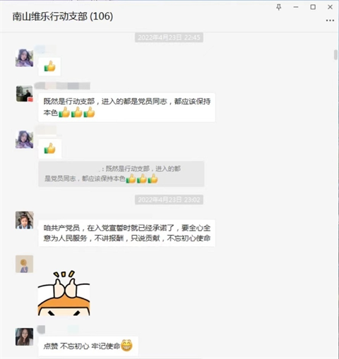 面对防疫压力,“南山维乐行动支部”微信群在第一时间建立。“刚开始3个人,忙一阵回来群里已经有超过70人……虽然大家的党组织关系不在一起,可能也从来没打过照面,但从这一刻开始,我们战疫的决心就聚到了一起。”行动支部书记张秋弟说到。