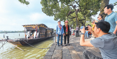 老党员在浙江嘉兴南湖湖心岛停泊的南湖红船旁留影。