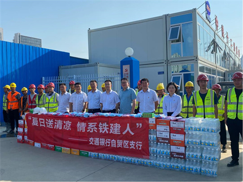 近段时间,苏州迎来持续高温天气,市气象台多次发布高温红色预警,室外温度普遍达到40℃以上。为切实履行社会责任,交通银行苏州自贸区支行前往共建单位中铁建花语云萃项目施工现场组织开展 “夏日送清凉,情系铁建人”活动,为在酷暑下辛勤劳动的工人们送去饮料、食品、清凉包等防暑降温物资,向他们的敬业精神和劳动付出致敬,叮嘱工人们高温作业要注意劳逸结合,给炎炎夏日坚守岗位的建设者们送上丝丝凉意和关怀。(作者:苏交轩)