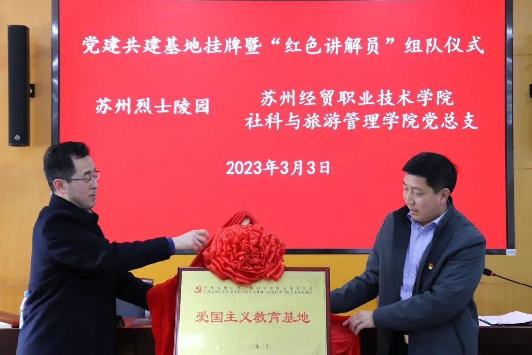 3月3日下午,一场庄重的组队仪式在烈士陵园电教馆举行。苏州市烈士陵园主任杨一渠与苏州经贸职业技术学院人文旅游学院党总支书记徐进签订《红色文化教育基地共建协议书》,并为“红色讲解员”志愿讲解队的5名队员举行了绶带仪式。
