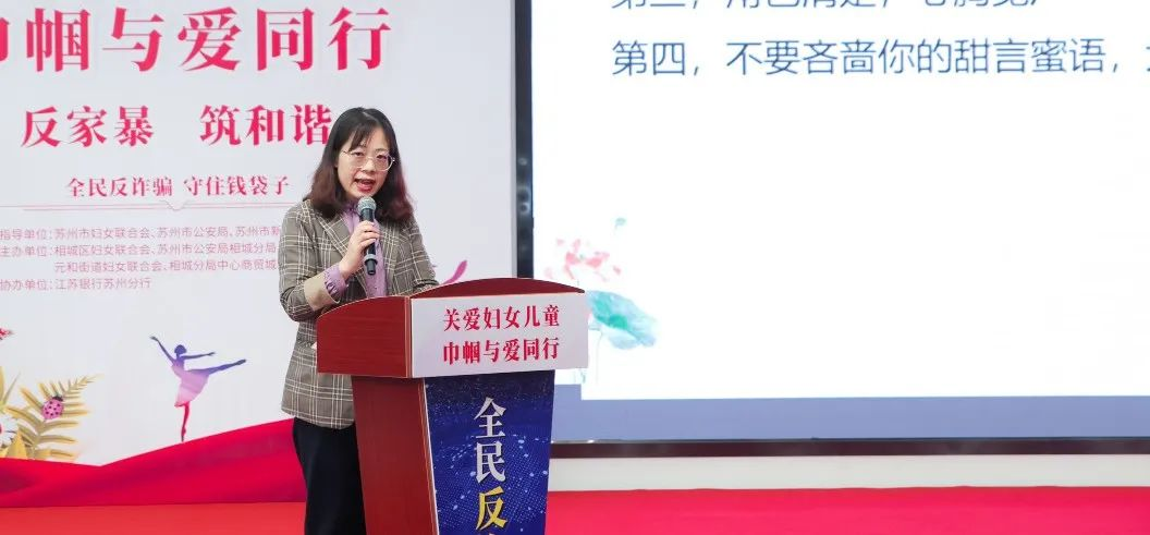 为预防和制止家庭暴力,进一步增强广大妇女和家庭的反家暴意识,构建和谐的社会氛围,活动现场,相城公安分局中心商贸城派出所民警俞纬芬和“爱之源”心理老师王海红为大家带来了“反对家暴、保护自我”主题讲座,以案释法,就如何预防家庭暴力进行自我保护的问题提出了建议与维权途径。