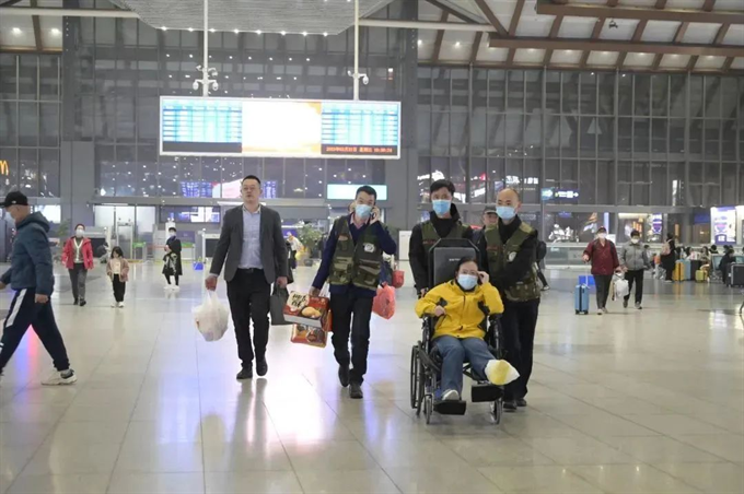 3月22日晚,春雨绵绵,依然挡不住工作人员和退役军人志愿者们的热情。他们早早驱车来到酒店,一起帮忙拿东西、推轮椅,并与上海铁路局苏州火车站工作人员相互配合,开通绿色通道,妥善安顿好这对退役军人老夫妻顺利登上火车。离别时,还贴心送上准备好的苏州特产。