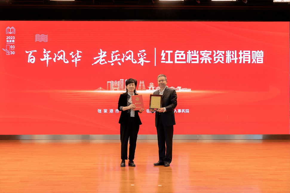 活动现场,张家港市退役军人事务局我局向市档案馆移交一批烈士档案,并捐赠“百年风华 老兵风采”红色档案资料。