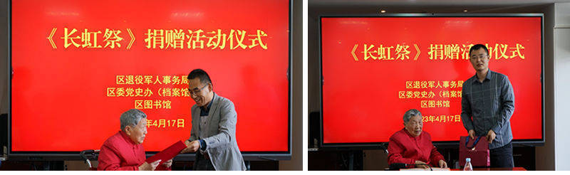 捐赠仪式上,陈不柔将《长虹祭》捐赠给吴江区档案馆和吴江图书馆,吴江区档案馆和吴江图书馆相关负责人分别向陈不柔颁发收藏证书和捐赠证书。