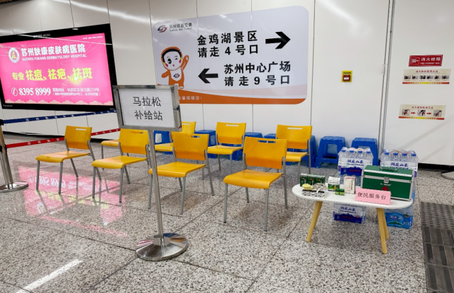 3号线东方之门站4号口外设置休息区和便民服务台,为参赛者免费提供矿泉水、充电宝等物品。
