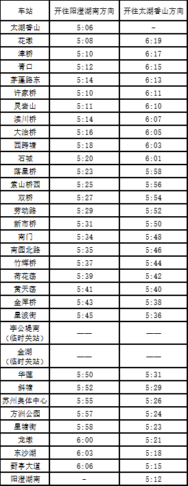 往太湖香山方向 :阳澄湖南站首班车由5:40提前至5:12,调整后第一班列车到达华莲站时间为5:30。