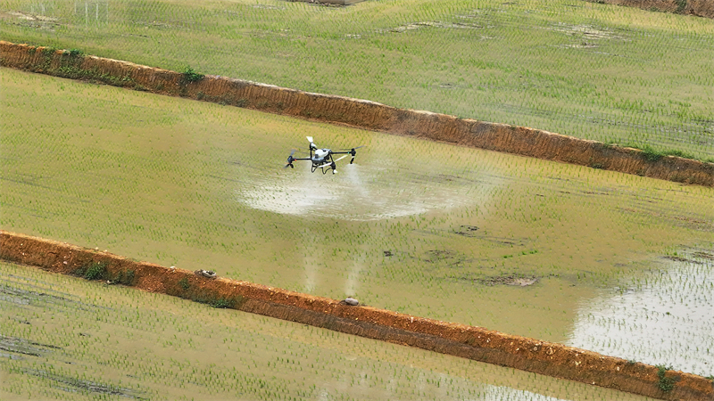 无人机正在播洒肥料。新华网发(牙举成 摄)