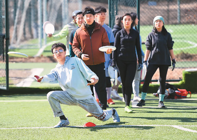 北京市朝阳区东枫国际体育园,飞盘爱好者在进行传接盘练习。