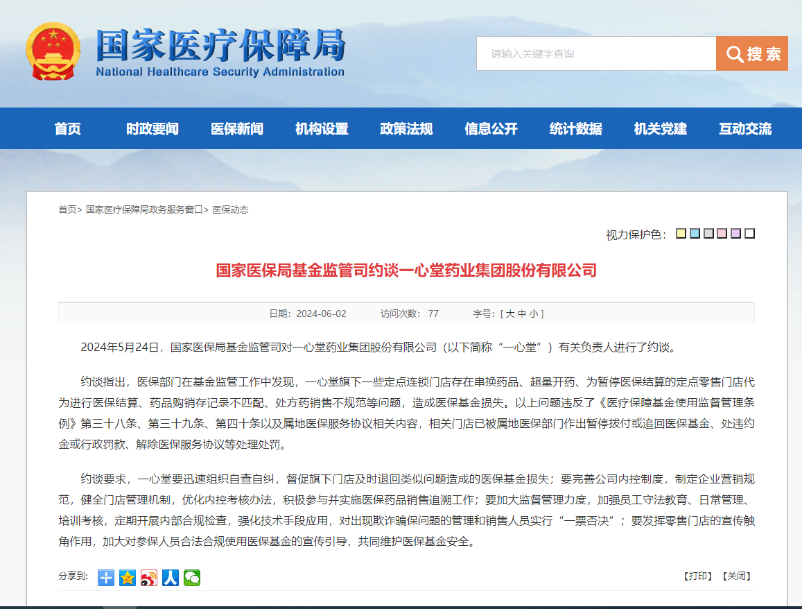 近日,国家医保局基金监管司对一心堂药业集团股份有限公司(以下简称“一心堂”)有关负责人进行了约谈。