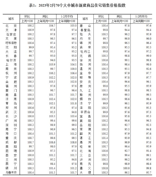 2月份,70个大中城市中,新建商品住宅销售价格同比上涨城市有14个,比上月减少1个;二手住宅销售价格同比上涨城市有7个,比上月增加1个。