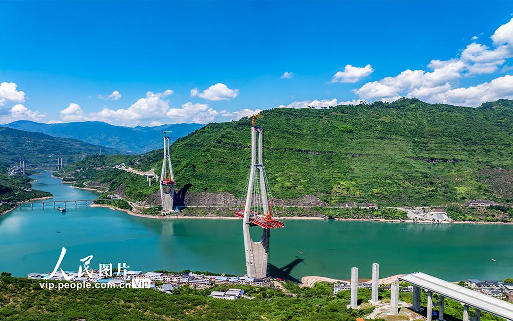 2024年6月17日,云南省绥江县,新市金沙江特大桥施工现场,工人们正在加紧施工。新市金沙江特大桥是连接云南与四川两省的重要枢纽,该桥全长1867米,桥跨680米,最大墩高297.51米。其建成通车后,将对推动川西滇北地区经济社会发展具有重要意义。曾三东摄(...