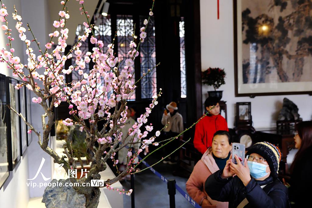 2024年1月8日,虽受冷空气影响的苏州寒气袭人,但在古典园林狮子林指柏轩、燕誉堂、问梅阁等厅堂展出的一件件含苞欲放的红梅、白梅、绿梅盆景,散发出冬日里的阵阵馨香,让游客提前感受到了浓浓春意。王建中摄(人民图片网)...